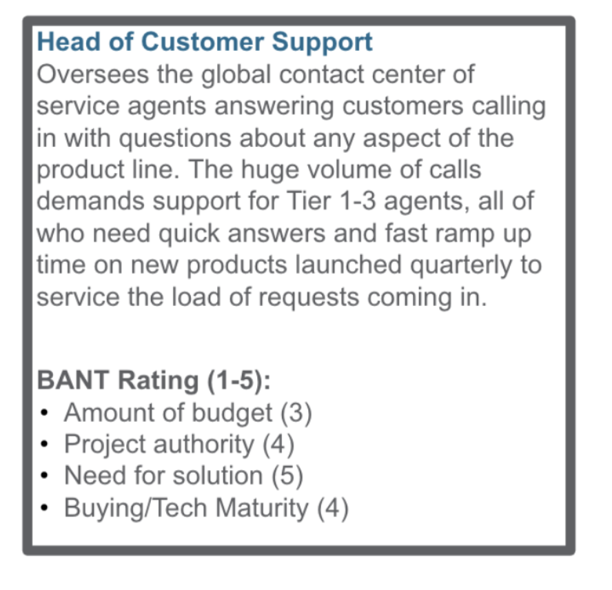 From there I want to assign a BANT rating of 1-5 on the level of importance of certain job functions and how it relates to the sales decision. This will help my lead qualifiers to understand what questions to ask. Here is an example: